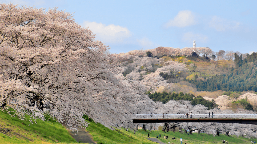 白石川沿いの一目千本桜は、柴田町船岡地区から隣町にかけて約1,300本が咲き誇る、全国屈指の桜の名所です。春にはこの絶景を求めて20万人以上の観光客が訪れます。